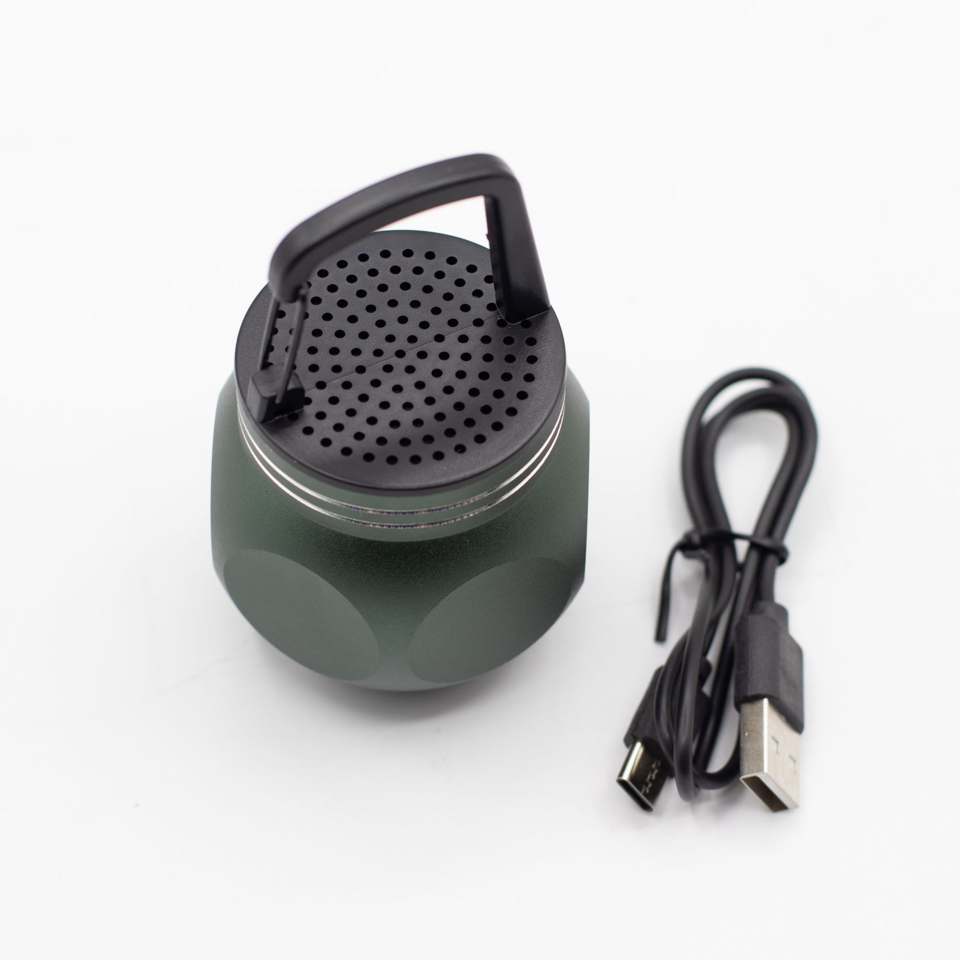 Altavoz mini verde con gancho para acampar