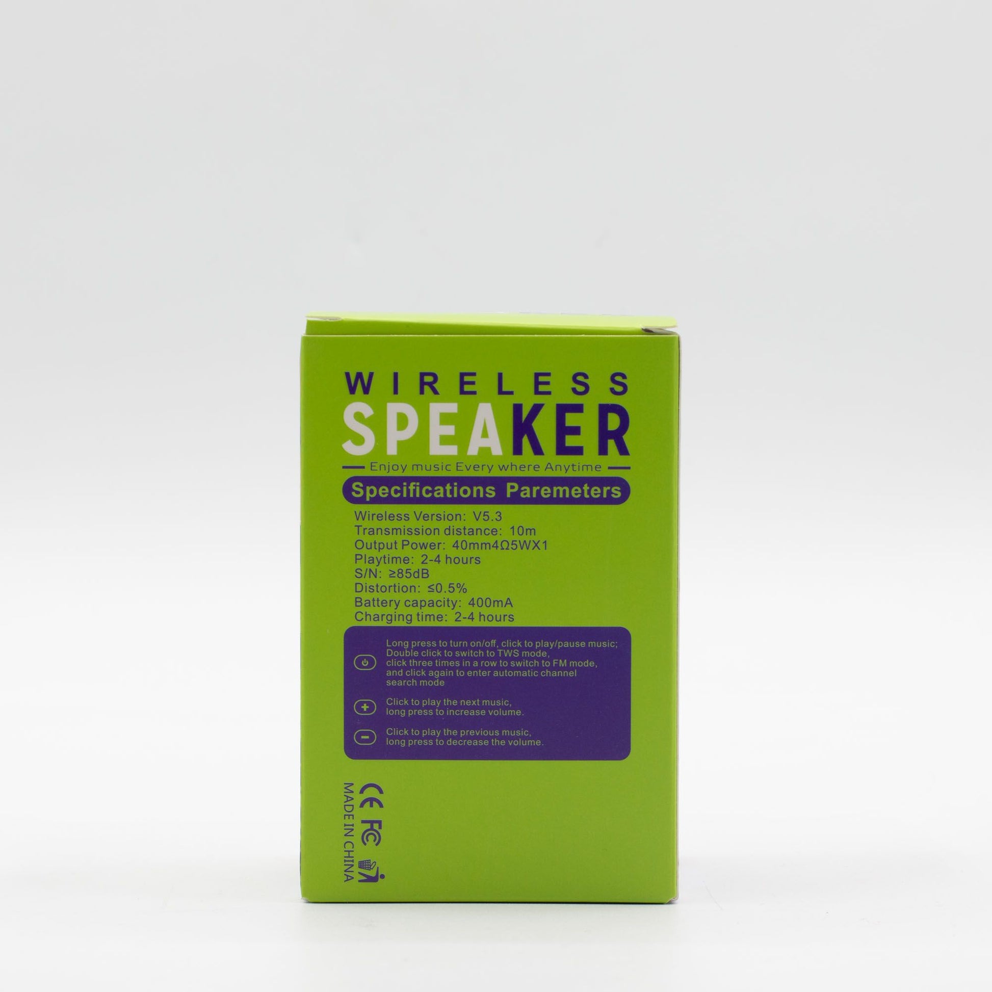 Este altavoz mini inalámbrico cuenta con Bluetooth V5.3 y un alcance de conexión estable de hasta 10 metros. Con una potencia de salida de 5 W y una relación señal‑ruido de ≥85 dB, produce un sonido equilibrado que se mantiene bien para su tamaño. La batería recargable de 400 mAh ofrece aproximadamente 2–4 horas de reproducción y se recarga por completo en 2–4 horas vía USB.