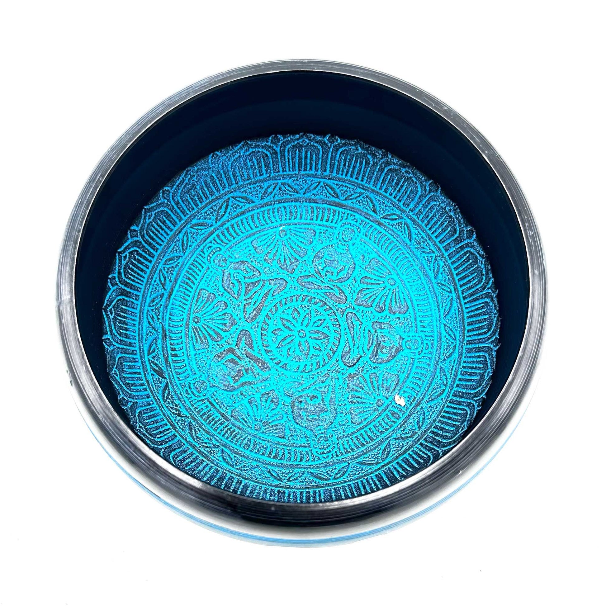Cuenco Tibetano de Polvo de la Tierra con Figura de Cinco Budas y Mantra Azul (16cm)